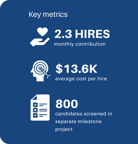 Significant cost savingsWhile producing 60% more hires and contributing to volume screening, IsoTalent's requisitions averaged $13.6k/hire, over half the cost of the next-best performing agency's $30k/average.