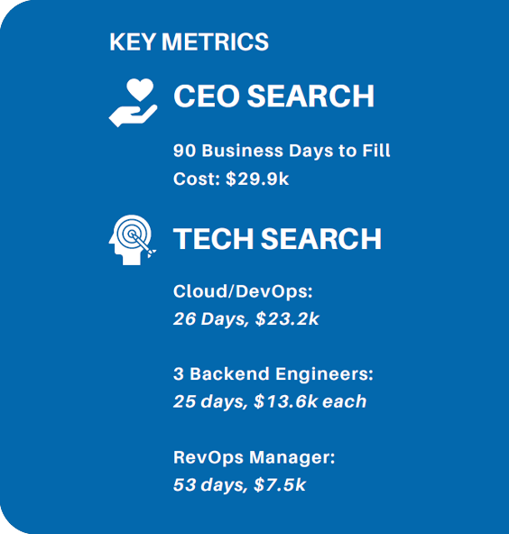 Rapid qualification and 50% average cost savingsThis high-quality CEO was placed in 90 business days, significantly lower than industry average of 4-7 months. Technologist searches ranged from 9-57 days.